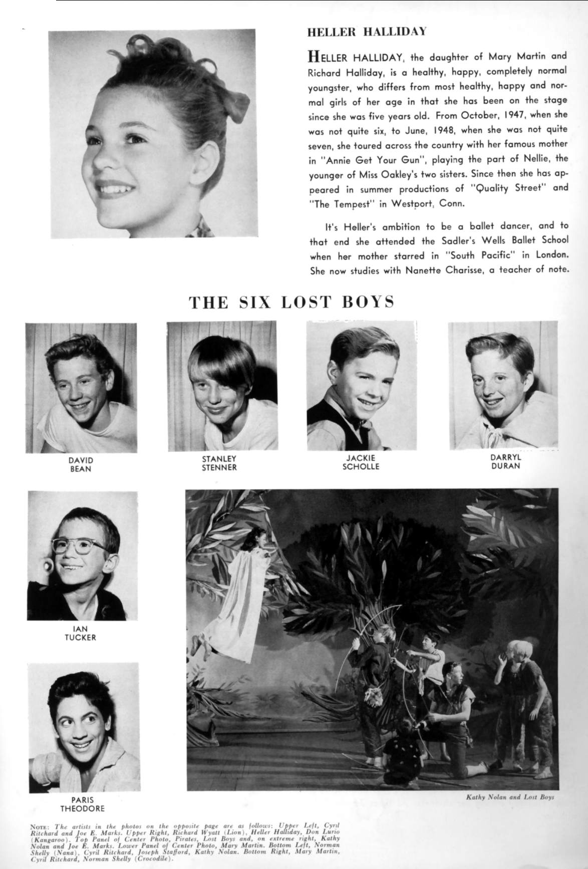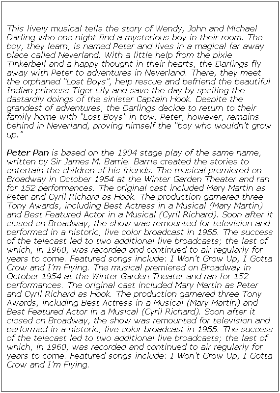 Peter Pan is based on the 1904 stage play of the same name, written by Sir James M. Barrie. Barrie created the stories to entertain the children of his friends. The musical premiered on Broadway in October 1954 at the Winter Garden Theater and ran for 152 performances. The original cast included Mary Martin as Peter and Cyril Richard as Hook. The production garnered three Tony Awards, including Best Actress in a Musical (Mary Martin) and Best Featured Actor in a Musical (Cyril Richard). Soon after it closed on Broadway, the show was remounted for television and performed in a historic, live color broadcast in 1955. The success of the telecast led to two additional live broadcasts; the last of which, in 1960, was recorded and continued to air regularly for years to come. Featured songs include: I Won’t Grow Up, I Gotta Crow and I’m Flying. The musical premiered on Broadway in October 1954 at the Winter Garden Theater and ran for 152 performances. The original cast included Mary Martin as Peter and Cyril Richard as Hook. The production garnered three Tony Awards, including Best Actress in a Musical (Mary Martin) and Best Featured Actor in a Musical (Cyril Richard). Soon after it closed on Broadway, the show was remounted for television and performed in a historic, live color broadcast in 1955. The success of the telecast led to two additional live broadcasts; the last of which, in 1960, was recorded and continued to air regularly for years to come. Featured songs include: I Won’t Grow Up, I Gotta Crow and I’m Flying.